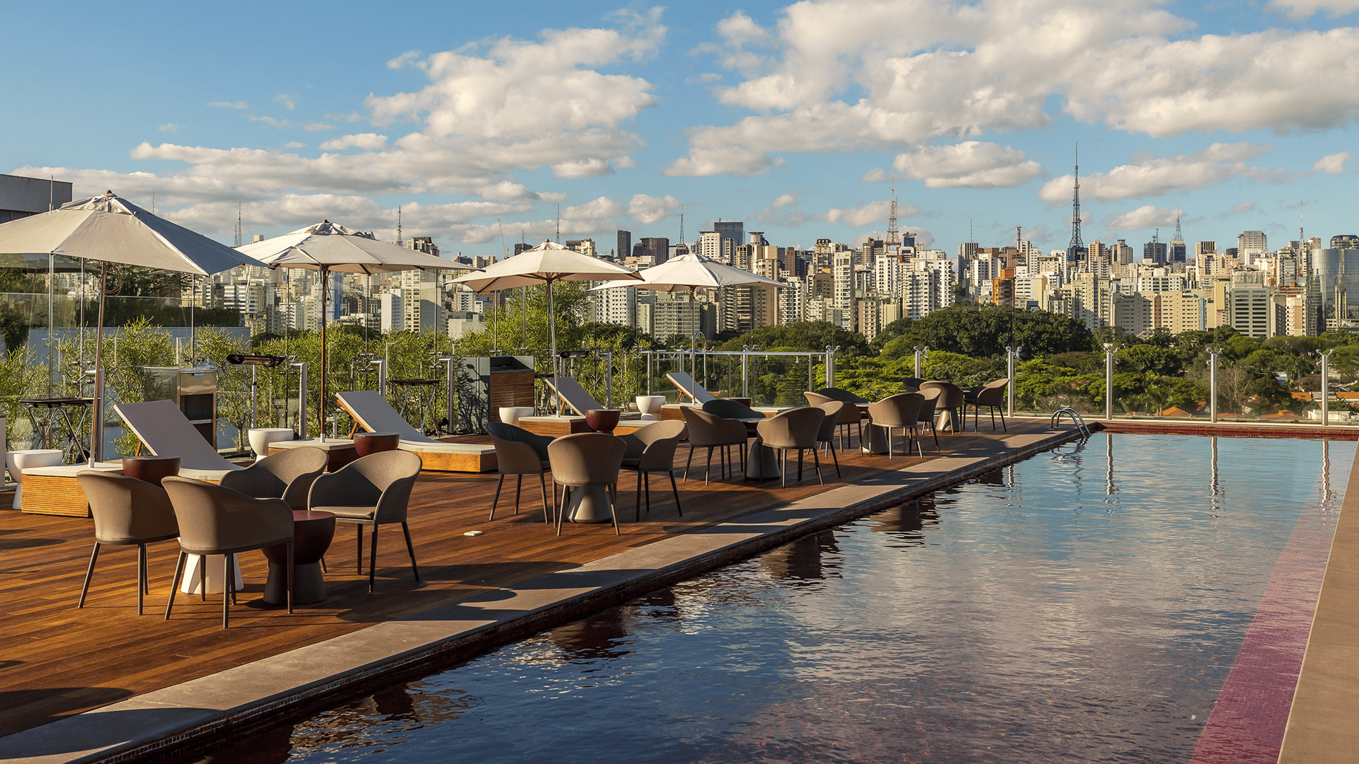 Localizado na cobertura do hotel, o Skye Restaurante & Bar possui uma piscina vermelha com vista panorâmica para o Parque Ibirapuera e o raro horizonte arborizado de São Paulo com o skyline da Avenida Paulista.