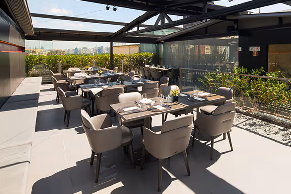 No rooftop do Unique, o Skye Restaurante & Bar reserva uma área no deck privativo para até 50 pessoas para coquetéis e até 30 pessoas para jantares.