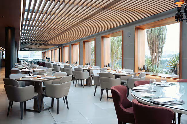 Localizado na cobertura do hotel, o Skye Restaurante & Bar possui uma piscina avermelhada e um fabuloso lounge com vista panorâmica para o Parque Ibirapuera e o raro horizonte arborizado de São Paulo com o skyline da Avenida Paulista.